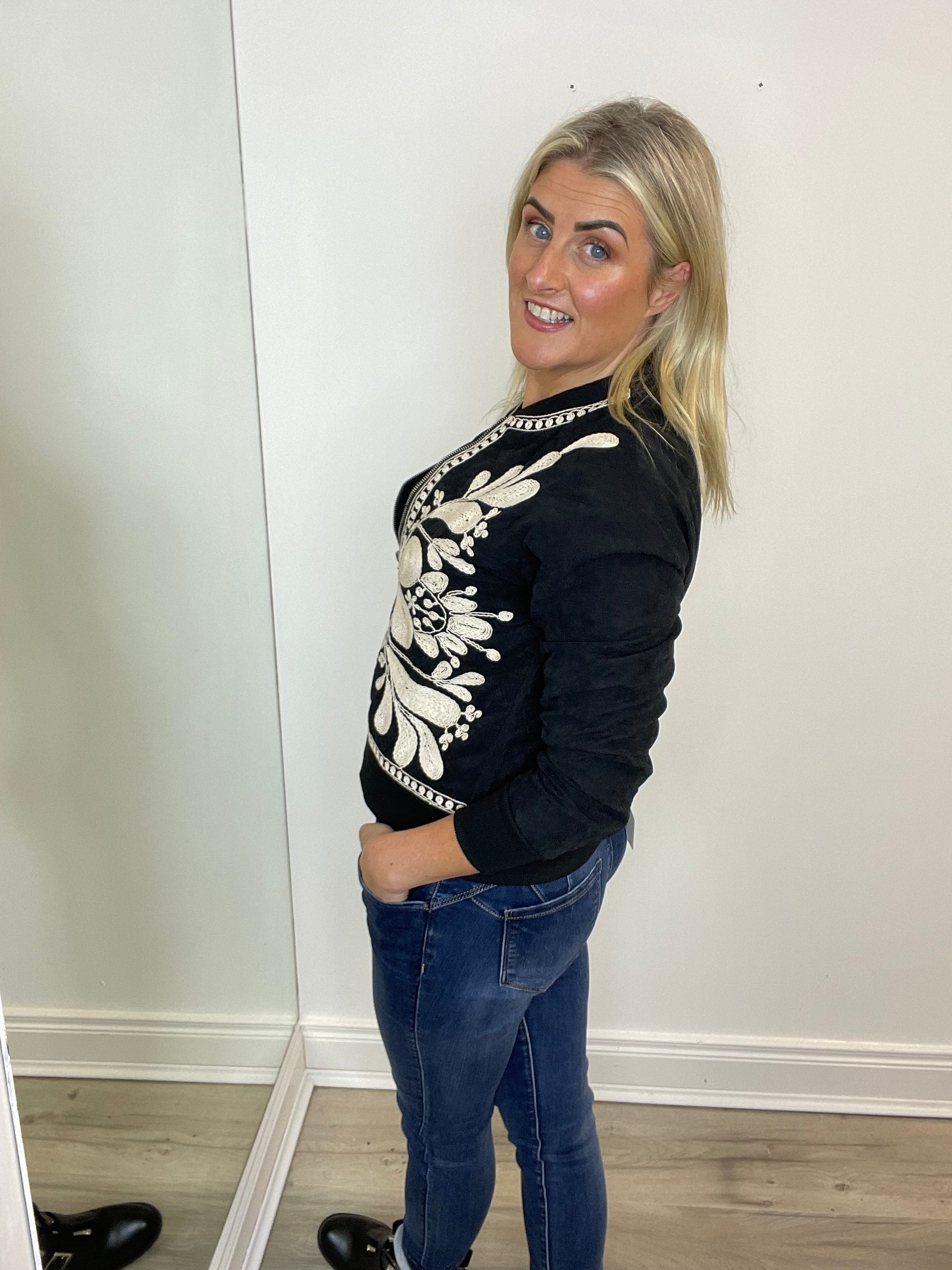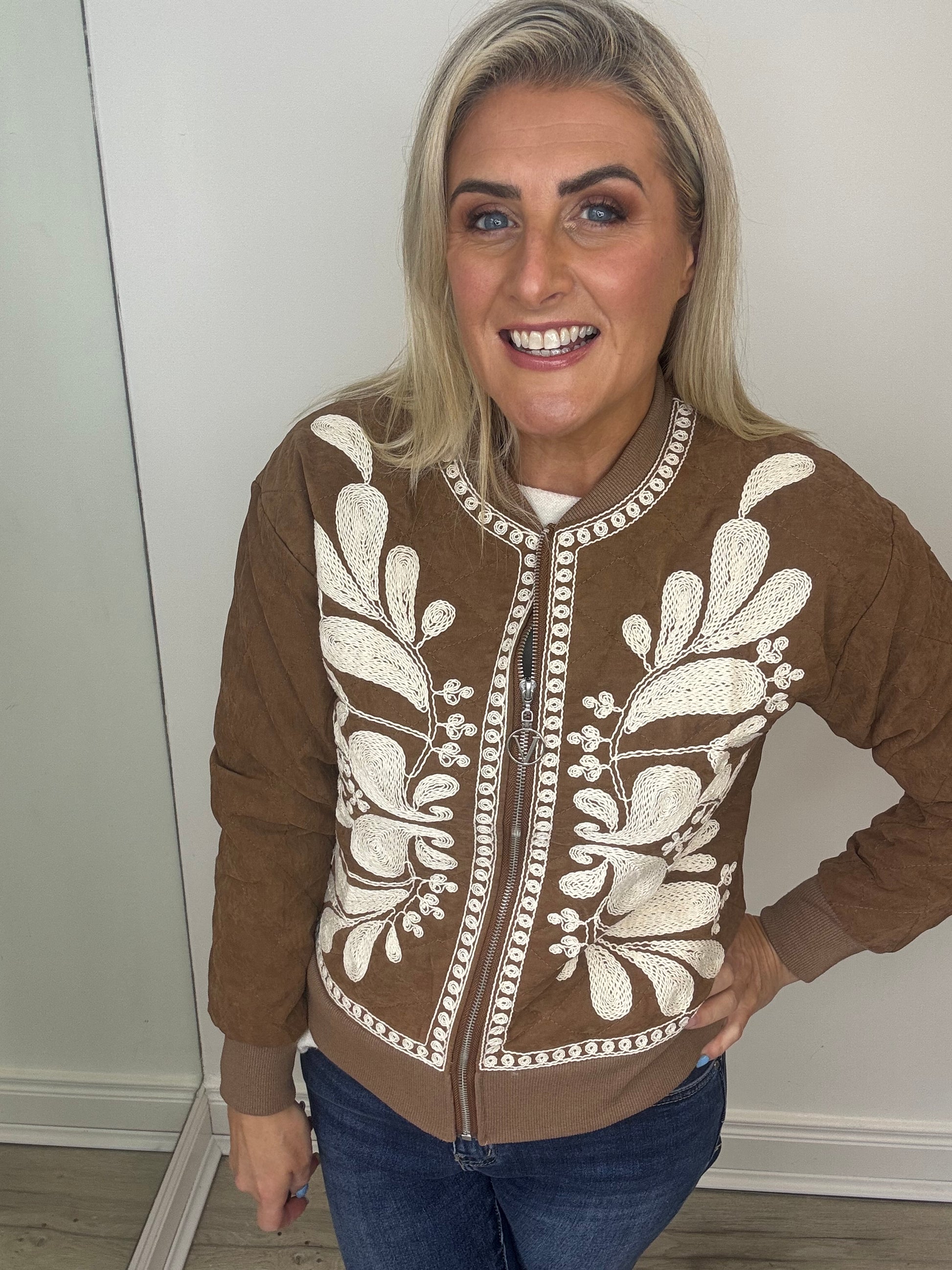 Stay stylish and warm this season with the Astrid Bomber Jacket. Featuring a sleek zip-up design, slight quilting for subtle texture, and embroidered embellishments throughout, this jacket adds a fashionable edge to your autumn and winter wardrobe. The elasticated waistband ensures a comfortable, flattering fit, making it a versatile must-have piece to elevate your outerwear collection.