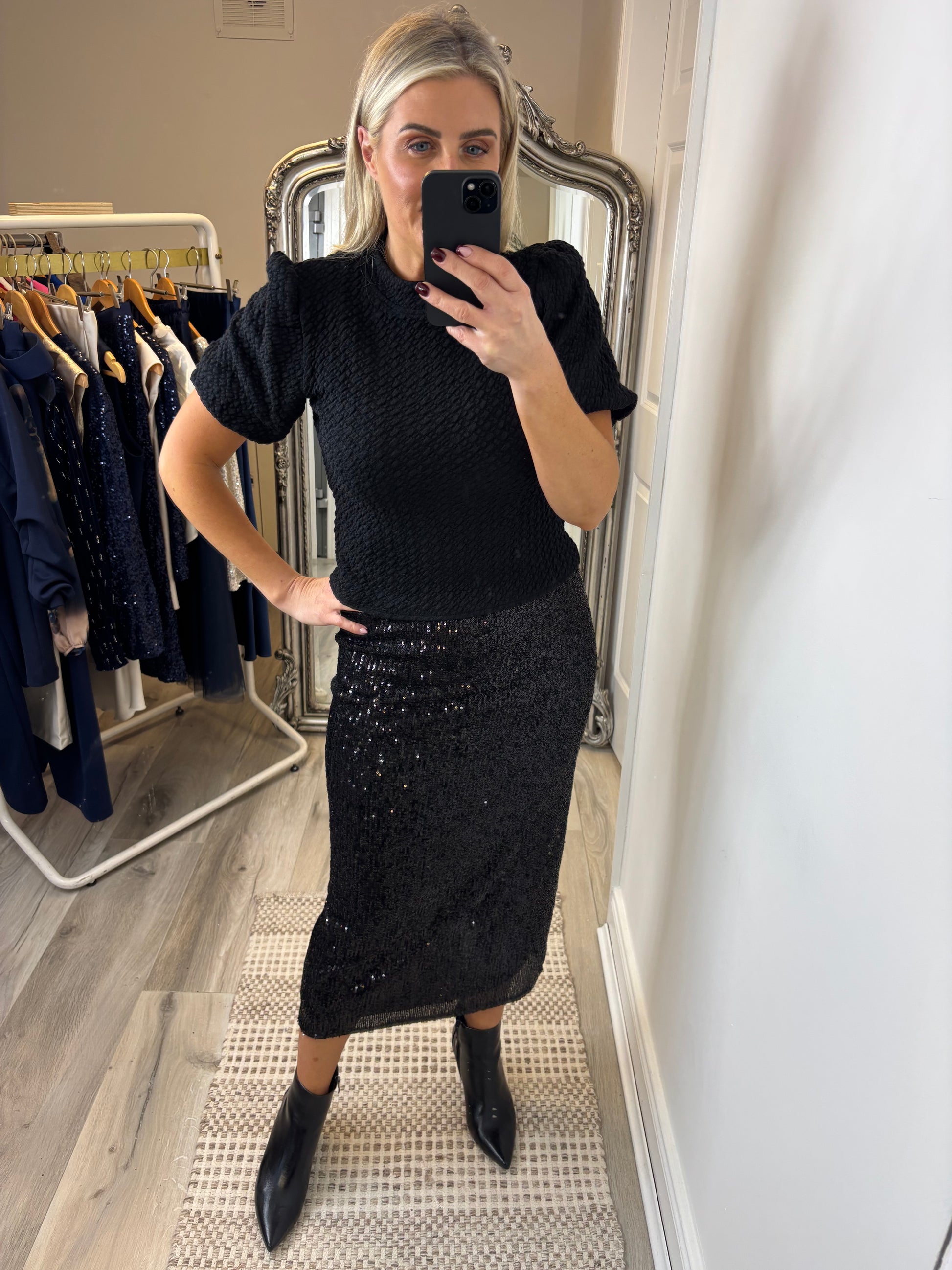 The Beatrice Top combines timeless elegance with modern comfort. Crafted from a luxurious polyester-elastin blend, this little black top delivers exceptional softness and gentle stretch for all-day wear. The charming puff sleeves and rounded neckline create a distinctly feminine silhouette, while the smart-casual design transitions effortlessly from office to evening. Perfect for layering or wearing solo, this versatile piece elevates your everyday wardrobe with understated sophistication.