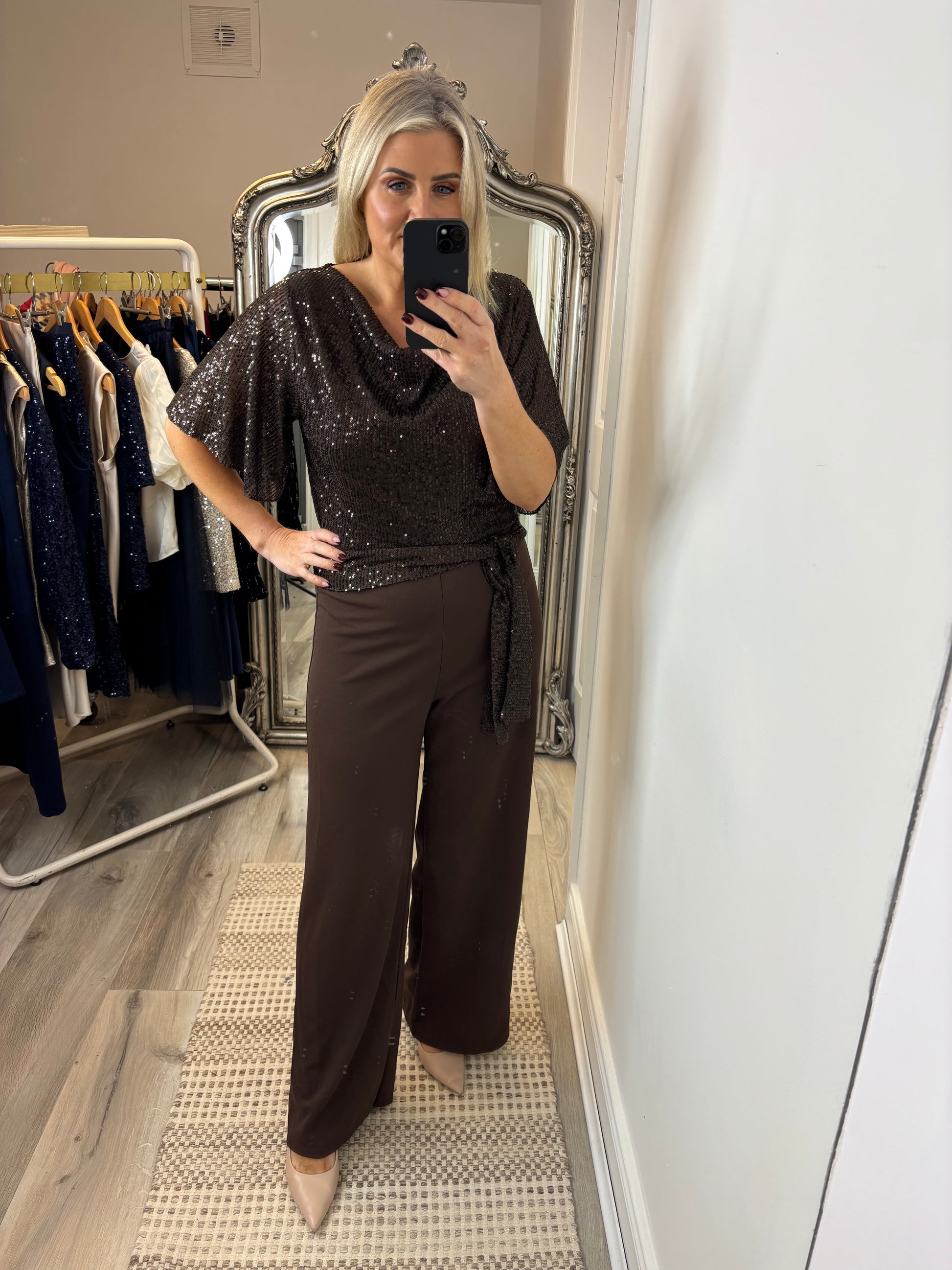 Make a statement this party season in the Bernice Jumpsuit. Featuring a dazzling sequined bodice that catches every light, this occasion-wear essential combines glamour with comfort. The elegant cowl neckline flatters while short sleeves keep you cool throughout the night. Perfect for celebrations, cocktail events, or anywhere you want to sparkle and shine. Effortless elegance meets show-stopping style.