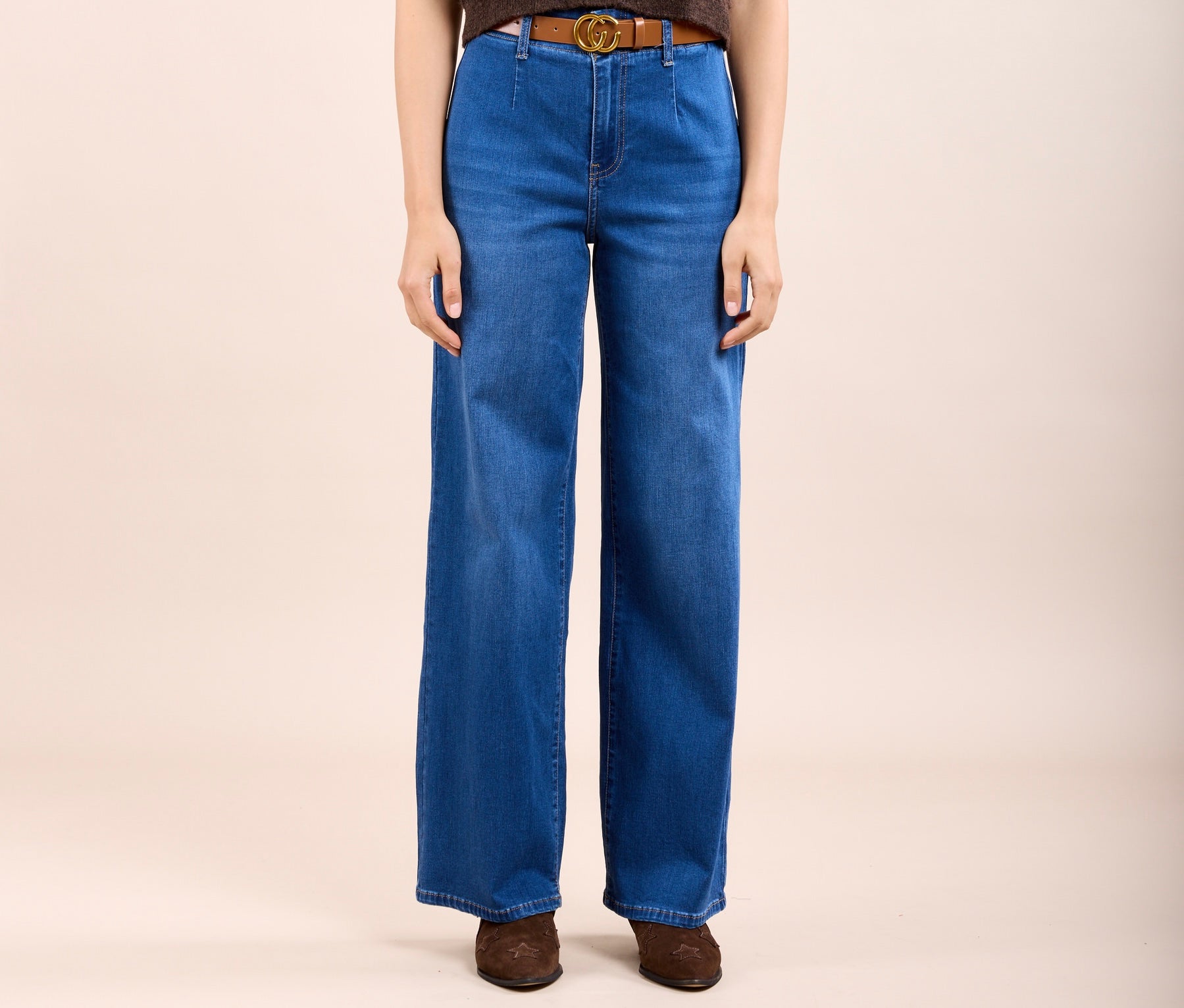 The Emer Highwaist Jeans feature a modern high-waisted design with a dark wash, complemented by a belted wide leg. This silhouette provides a flattering shape that is versatile for both casual and dressy occasions, enhancing comfort and style with a tailored look.
