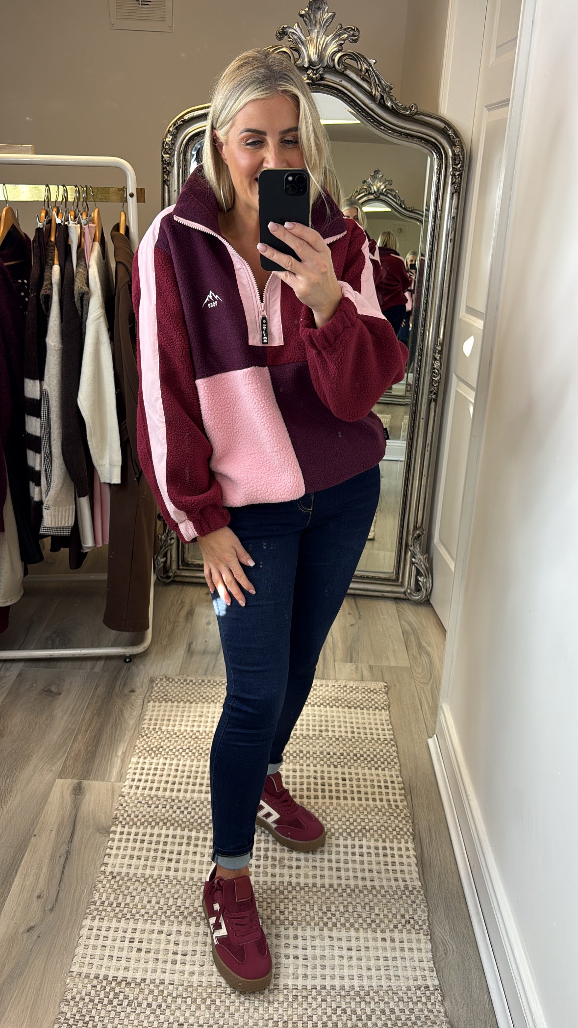 The Maya Fleece combines comfort with eye-catching style. This 3/4 zip pullover features long sleeves and a flattering elasticated waist for a tailored fit. The striking colour-block design blends wine, burgundy, and soft baby pink segments for a modern look that transitions effortlessly from casual outings to relaxed weekends. Perfect for layering or wearing solo, this versatile piece brings warmth and personality to your everyday wardrobe. 45520