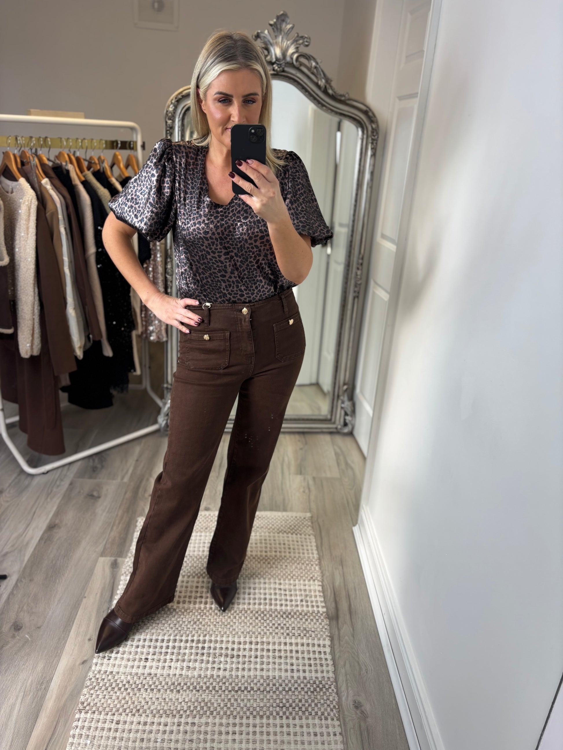 Elevate your wardrobe with the Nala Leopard Print Top, where timeless animal print meets contemporary elegance. Crafted with a luxurious satin feel fabric, this statement piece features a flattering V-neckline and voluminous puff sleeves that exude sophistication. The striking leopard pattern is beautifully complemented by rose gold backing, adding a touch of glamour and dimension. Perfect for those who appreciate high-fashion styling with effortless versatility—dress it up for evening occasions or style it casually for a chic daytime look. A wardrobe essential that commands attention.