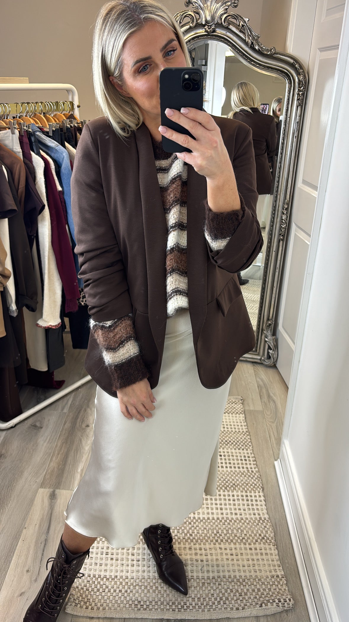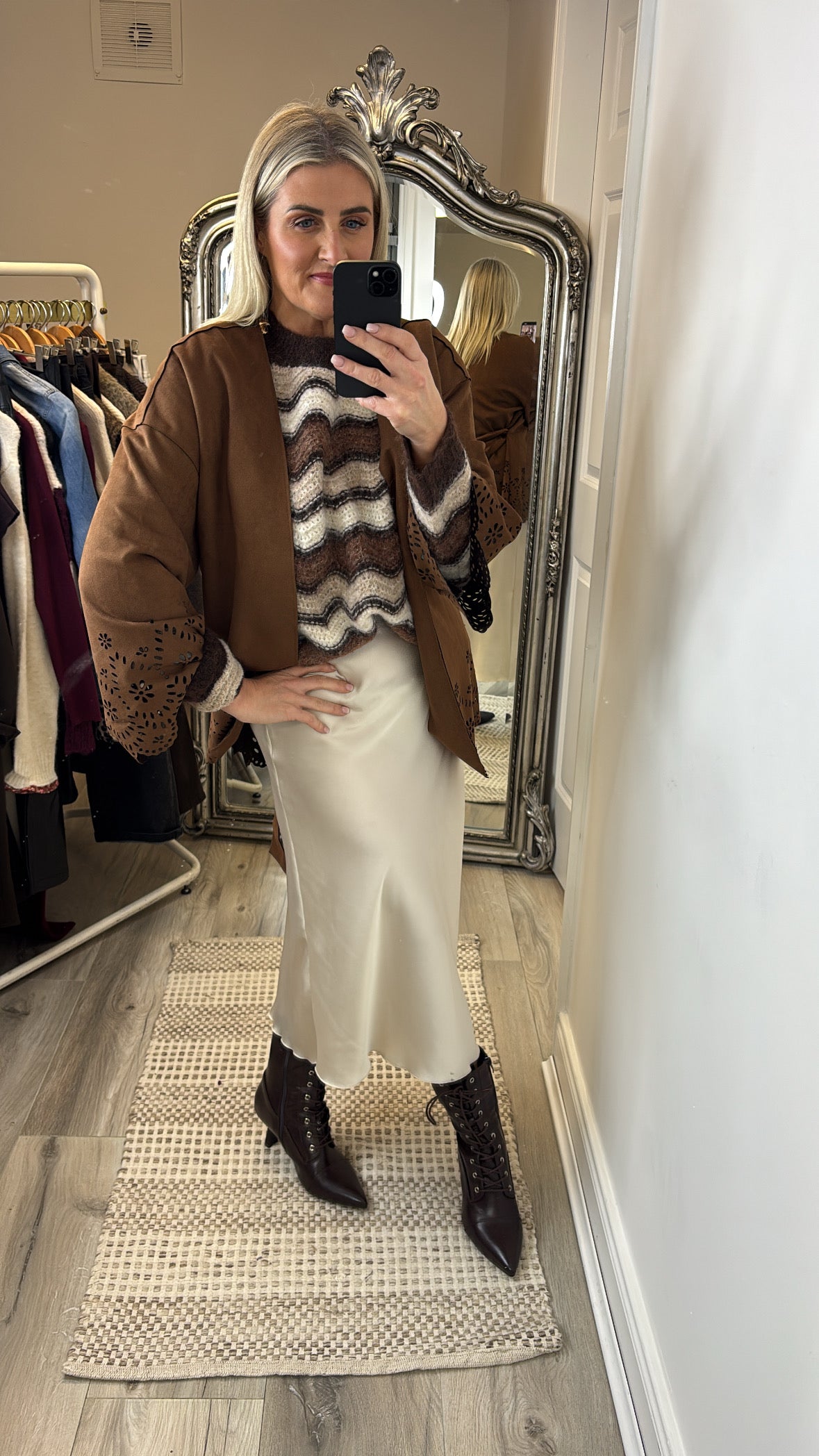 The Roisin Jumper is your perfect autumn essential, featuring cozy soft knit fabric in warm brown and cream zig zag stripes. Its flattering round neck and three elegant gold buttons on one shoulder add a stylish touch, making it easy to dress up or down. Wrap yourself in comfort and seasonal charm with this must-have jumper.