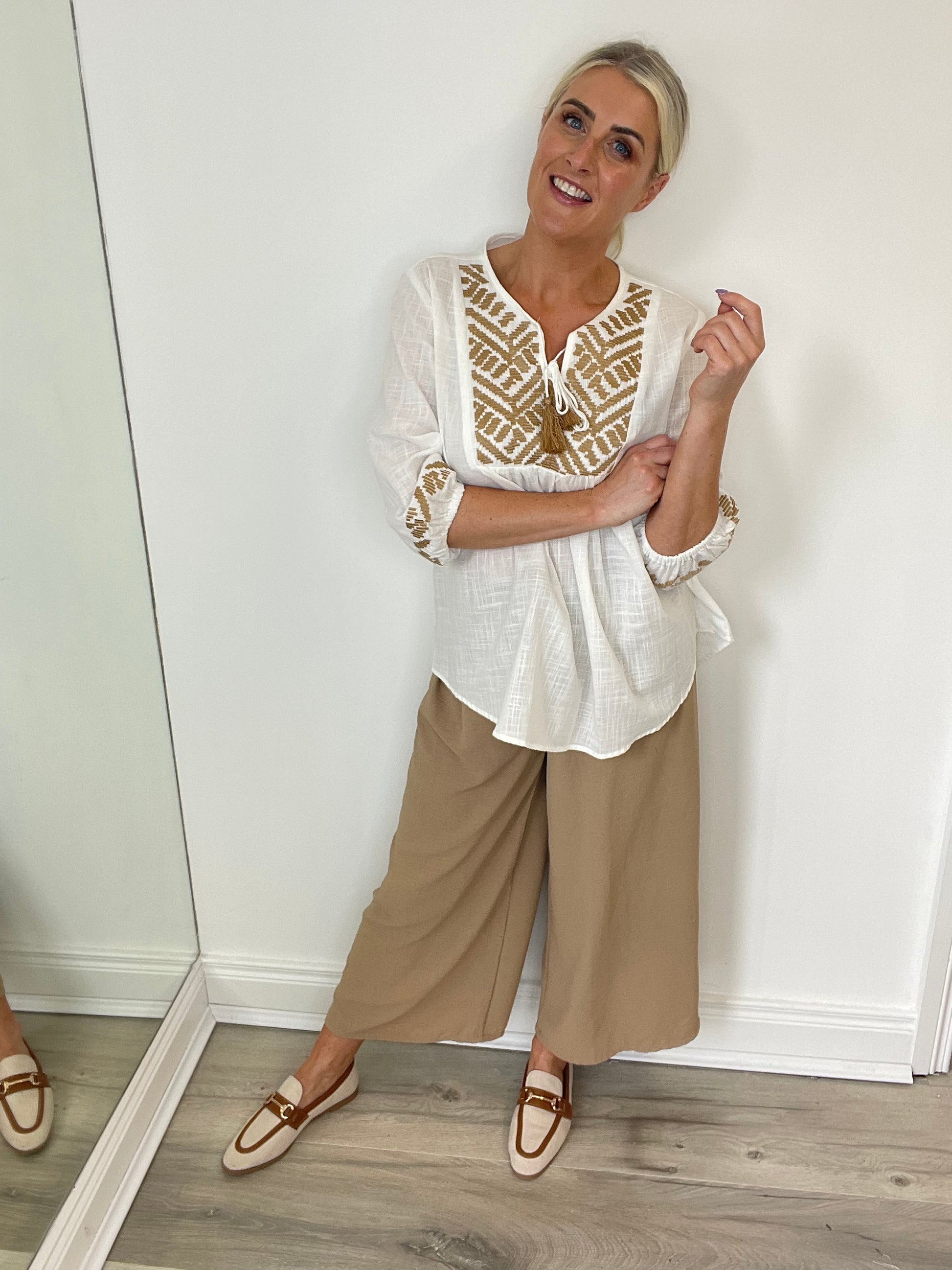 Sophisticated yet comfortable, the Susie Tie Trousers effortlessly add a touch of luxury to your wardrobe. With a flattering tie waist and relaxed fit, these 3/4 length trousers are perfect for both work and play. Elevate your style with ease. 2161
